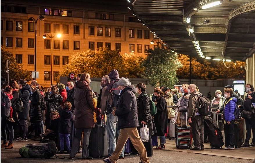 Theo Daily Mail, hàng loạt video đăng tải trên mạng xã hội Twitter cho thấy rất đông người Paris ùn ùn rời thành phố nhằm tránh lệnh giới nghiêm lúc 9h tối và lệnh phong toả lần hai kể từ nửa đêm.