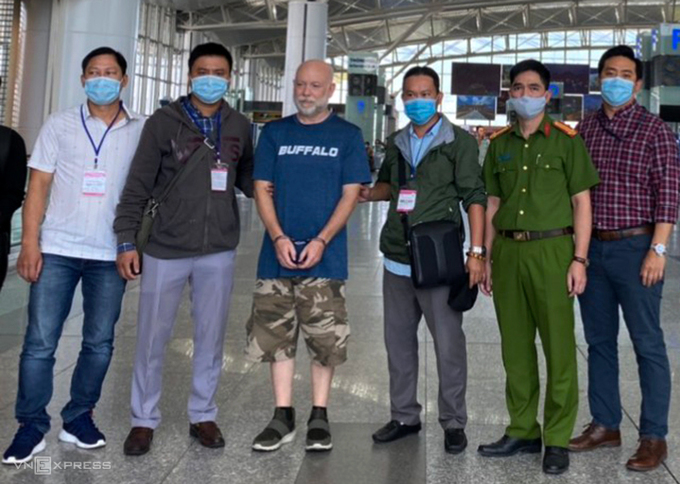 Wade Astle (áo xanh, c̣ng tay) bị cảnh sát áp giải ra sân bay Nội Bài hôm 23/10. Ảnh: Quyết Nguyễn