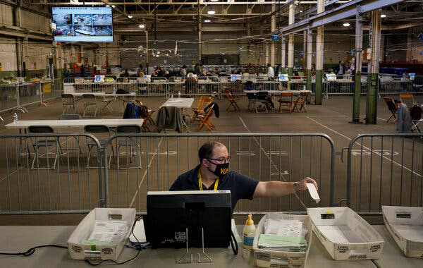Tại một bàn kiểm phiếu, một quan sát viên đảng Cộng ḥa phản đối mọi lá phiếu nhân viên bầu cử rút ra từ một chiếc túi chỉ v́ chúng được gập lại. Một quan sát viên khác đă bị mời ra về hôm 21/11 v́ không đeo khẩu trang đúng cách.