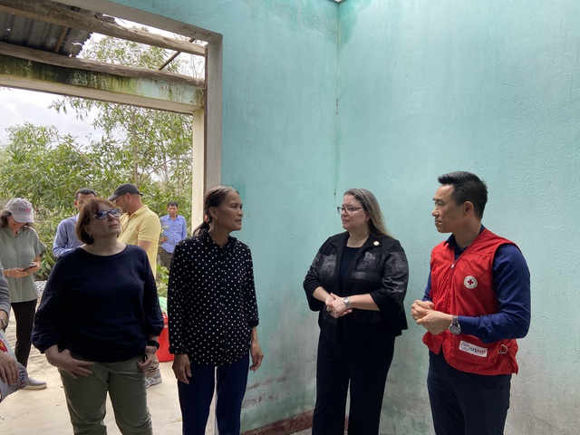 Tổng Lănh sự Mỹ Marie Damour (thứ 2 từ phải sang) và Giám đốc USAID Ann Marie Yastishock (trái) thăm một gia đ́nh bị thiệt hại do lũ lụt tại Quảng Nam. (Ảnh: ĐSQ Mỹ)