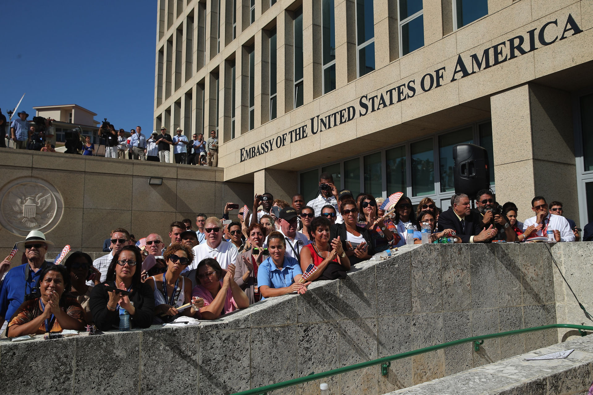 Nhân viên và khách mời ngày khai trương Ṭa Đại Sứ Mỹ tại Cuba năm 2015. (H́nh:Chip Somodevilla/Getty Images)