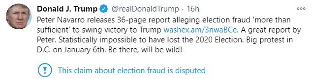 Dòng tweet trên được đăng tải vào ngày 19/12, khi ông Trump chia sẻ một bài báo về việc cố vấn thương mại Nhà Trắng Peter Navarro đã công bố một bản báo cáo dài 36 trang về những bằng chứng gian lận bầu cử mà ông Trump và đội ngũ tin là đủ để lật ngược chiến thắng của ông Biden.