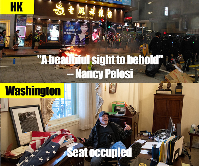 Khi cảnh tượng tương tự xảy ra ở Hồng Kông hồi năm 2019, một số chính trị gia Mỹ như bà Pelosi đã gọi những người biểu tình gây bạo loạn là chiến binh tự do.