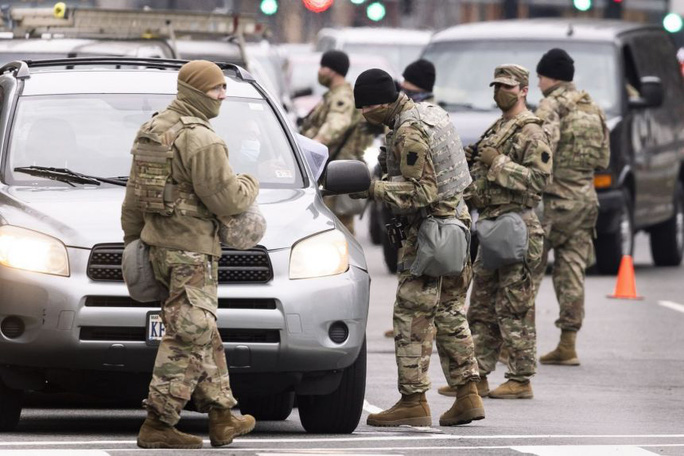 Lực lượng Vệ binh Quốc gia tại một chốt kiểm soát ở Washington DC đảm bảo an toàn các con đường dẫn đến tòa nhà Quốc hội Mỹ. Ảnh: EPA-EFE