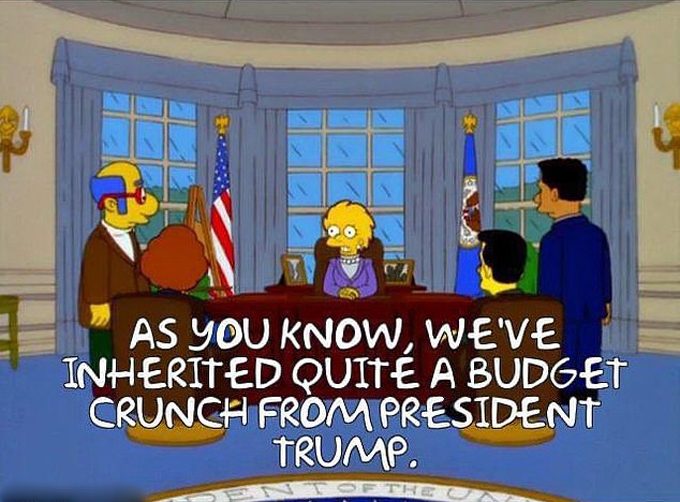 Bên cạnh đó, Gia đình Simpson cũng dự đoán về nhiệm kỳ của Tổng thống Trump kết thúc ngay trước khi Lisa kế nhiệm. Nhân vật hoạt hình nói với các nhân viên của mình trong phim: "Như các bạn đã biết, chúng ta thừa hưởng một cuộc khủng hoảng ngân sách từ Tổng thống Trump".