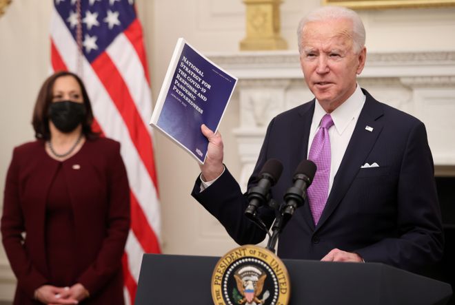 Nhằm ngăn chặn đại dịch lây lan, Tổng thống Biden ký sắc lệnh yêu cầu người Mỹ đeo khẩu trang trong 100 ngày tới. Ông Biden cũng sẽ ký một sắc lệnh khác cho các cơ quan liên quan nhằm yêu cầu hành khách đeo khẩu trang trên máy bay, xe lửa và các phương tiện vận tải công cộng khác. Ông Biden nhấn mạnh đeo khẩu trang là “hành động yêu nước”. Ông còn nhấn mạnh ngoài việc trình kết quả xét nghiệm Covid-19 âm tính trước khi lên máy bay, những hành khách đến Mỹ bây giờ sẽ cần trải qua quá trình cách ly ngay sau khi máy bay hạ cánh, theo AFP.Bên cạnh đó, chiến lược của Tổng thống Biden còn kêu gọi gia tăng sản xuất vắc xin Covid-19 và tiêm loại vắc xin này. Ông Biden đã đặt mục tiêu 100 triệu người sẽ được tiêm vắc xin Covid-19 trong 100 ngày đầu nhậm chức. Giới chuyên gia hàng đầu của ông Biden cho rằng mục tiêu này có thể đạt được dù đến nay chỉ có 16,5 triệu người ở Mỹ được tiêm vắc xin Covid-19, theo AFP.