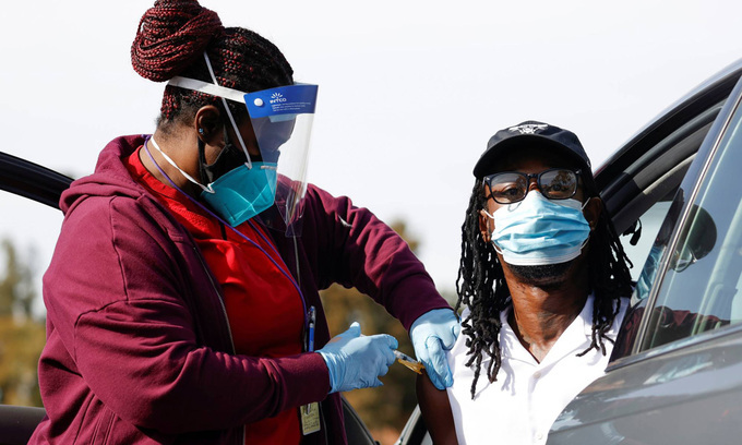 Một y tá tiêm vaccine Covid-19 cho người dân tại thành phố Pasadena, bang California, Mỹ, hôm 12/1. Ảnh: Reuters.