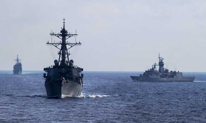Tàu hộ vệ Australia (phải) diễn tập cùng tàu chiến Mỹ hồi tháng 4/2020. Ảnh: US Navy.