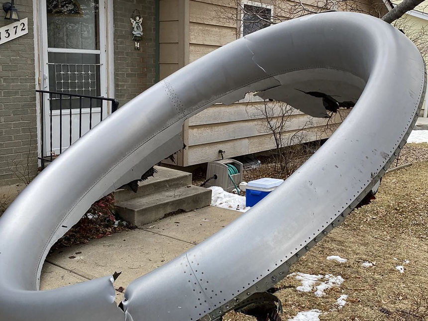 Mảnh vỡ máy bay trước nhà dân ở Broomfield, Colorado vào ngày 20/2. Ảnh: Cảnh sát Broomfield.