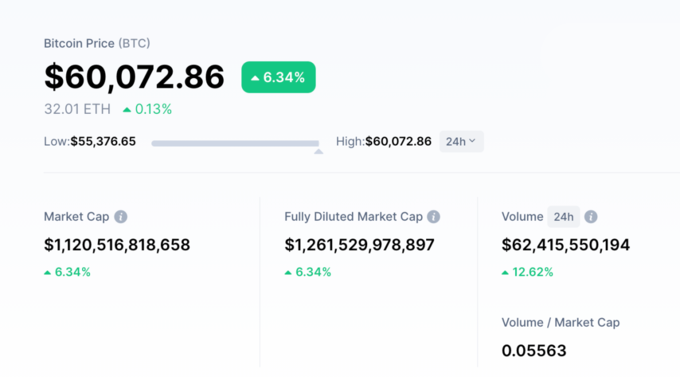 Giá một đồng Bitcoin, theo cập nhật của CoinmarketCap, vừa vượt ngưỡng 60.000 USD, xác lập mức kỷ lục mới. Với mức giá này, vốn hóa của Bitcoin đạt hơn 1.120 tỷ USD.Dù còn nhiều tranh cãi, Bitcoin vẫn thu hút sự quan tâm lớn gần đây. Động lực tăng giá của tiền số này đến từ nhu cầu của thị trường, đặc biệt là sự tham gia của những nhà đầu tư lớn.