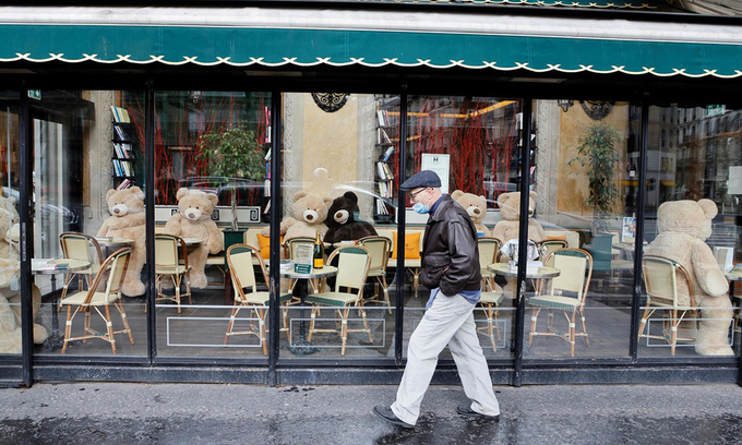 Người đàn ông đeo khẩu trang đi qua quán cà phê nổi tiếng Les Deux Magots ở thủ đô Paris hôm 20/3. Ảnh: AFP.