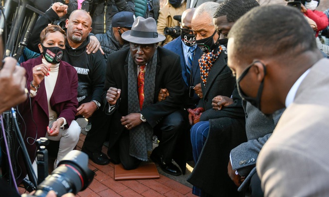 Gia đình George Floyd quỳ 8 phút trước phiên tòa xử cảnh sát da trắng. Để tưởng nhớ cái chết của người đàn ông da màu, trước phiên tòa, gia đình George Floyd đã quỳ gối trong 8 phút 46 giây, bằng thời gian nạn nhân bị cảnh sát ghì chân vào cổ.
