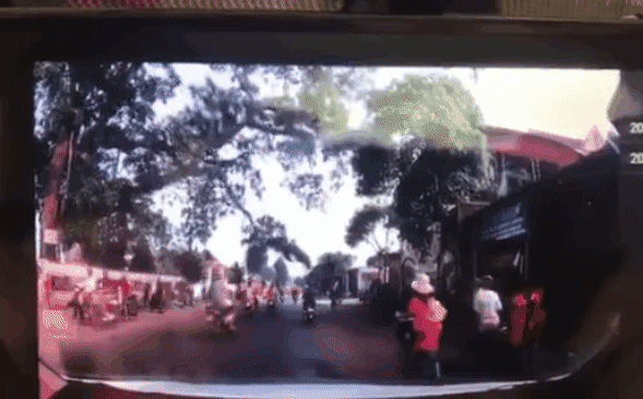 Khoảng 16h30' ngày 31/3, 2 cành cây ở bên trái và bên phải bất ngờ gãy đổ xuống đường liên xã Nghĩa Khánh, đè trúng 4 học sinh. Trong ảnh, 1 chiếc xe máy do người đàn ông điều khiển chở 3 cháu học sinh đi học về bị cành cây đè gãy bánh trước. May mắn cả 4 ông cháu không bị thương.