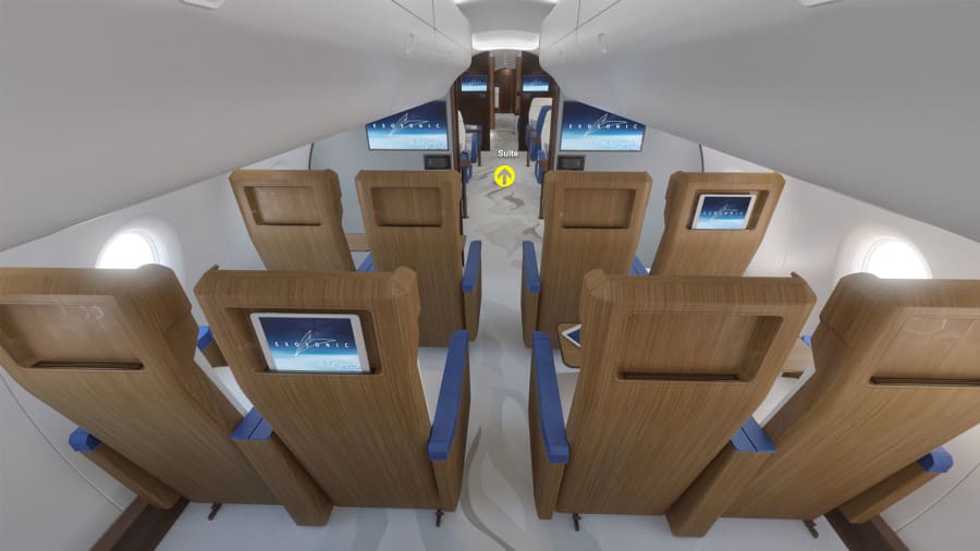 Tại cabin chính, Exosonic bố trí 20 ghế hành khách hạng thương gia, cùng hai pḥng trưng bày, hai nhà vệ sinh, cùng không gian chứa đồ lớn. "Thiết kế của cabin được truyền cảm hứng từ cơ quan hành pháp Mỹ, các nhiệm vụ và giá trị của nó, giống như một con chim ưng, nhanh nhẹn và sang trọng", bà Chahan nói. Ảnh: CNN.