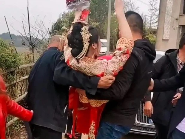 Một ông bố chồng dù tuổi cao sức yếu nhưng nhờ sự trợ giúp của những người xung quanh, cuối cùng ông đã bế được con dâu từ xe hoa vào nơi tổ chức lễ cưới với khoảng cách vài trăm mét.Trong khi cô dâu tỏ ra không thoải mái và cúi đầu xấu hổ thì chú rể đứng bên cạnh lại bật cười vui vẻ.