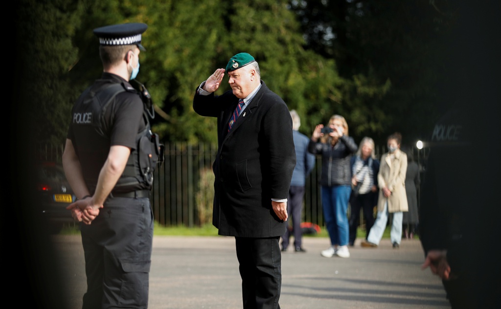 Một cựu quân nhân đứng nghiêm và chào kiểu nhà binh trước cung điện Windsor, trong khi nhiều người mang hoa đến để tưởng nhớ Hoàng thân Philip.