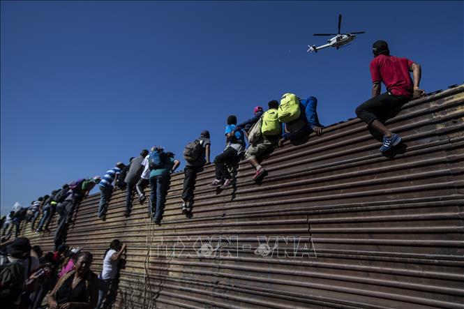 Người di cư trèo qua bức tường biên giới Mexico - Mỹ, gần cửa khẩu El Chaparral ở Tijuana, bang Baja California, Mexico. Ảnh: AFP/TTXVN