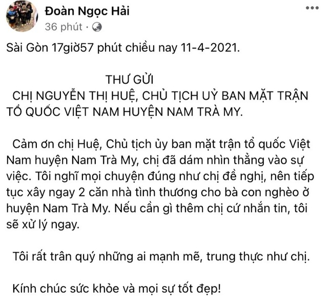 Ông Đoàn Ngọc Hải đăng bức thư trên trang Facebook cá nhân, đồng ý tiếp tục hỗ trợ để huyện Nam Trà My xây nhà cho người nghèo.