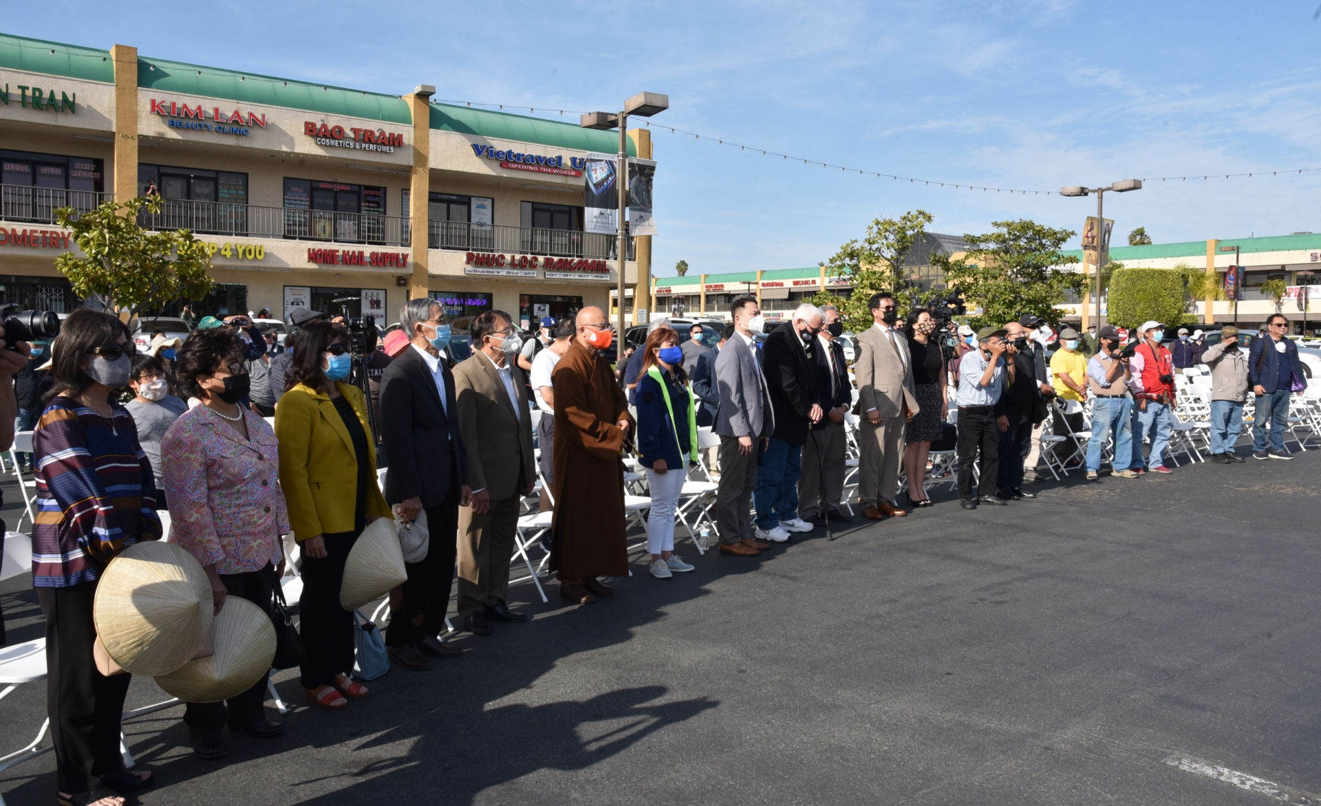 Đồng hương cùng quan khách chào cờ khai mạc buổi biểu t́nh “Stop The Hate” tại băi đậu xe đối diện thương xá Phước Lộc Thọ, trên đường Bolsa Ave, Westminster. (H́nh: Văn Lan/Người Việt)