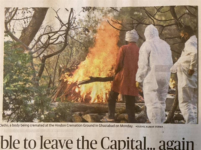 Lò thiêu xác quá tải, có trường hợp người dân đành mang xác ra vườn lấy cành khô trên cây mà đốt. (Ảnh chụp báo chí Ấn Độ do Đại sứ Phạm Sanh Châu cung cấp)