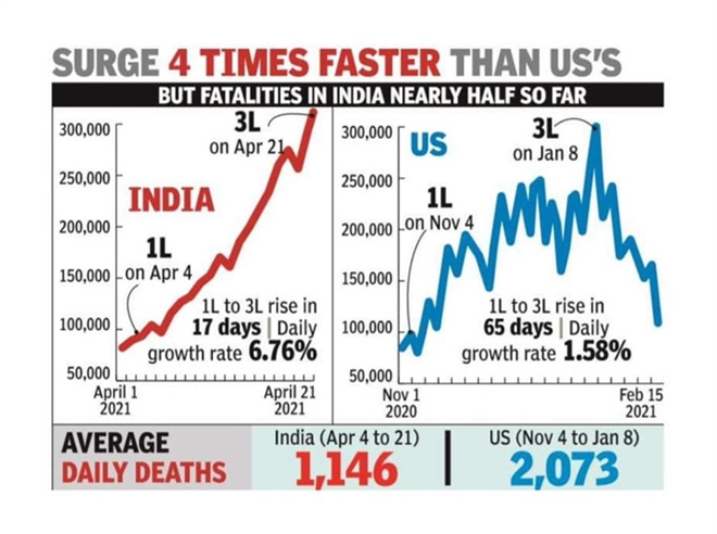 Bộ Y tế Ấn Độ thông báo hôm 23/4, con số nhiễm COVID-19 đã chạm mốc 332.730 ca, thêm hơn 330.000 ca nhiễm và hơn 2.200 ca tử vong sau 24 giờ. Ấn Độ hiện là vùng dịch lớn thứ 2 thế giới với hơn 16 triệu ca bệnh.