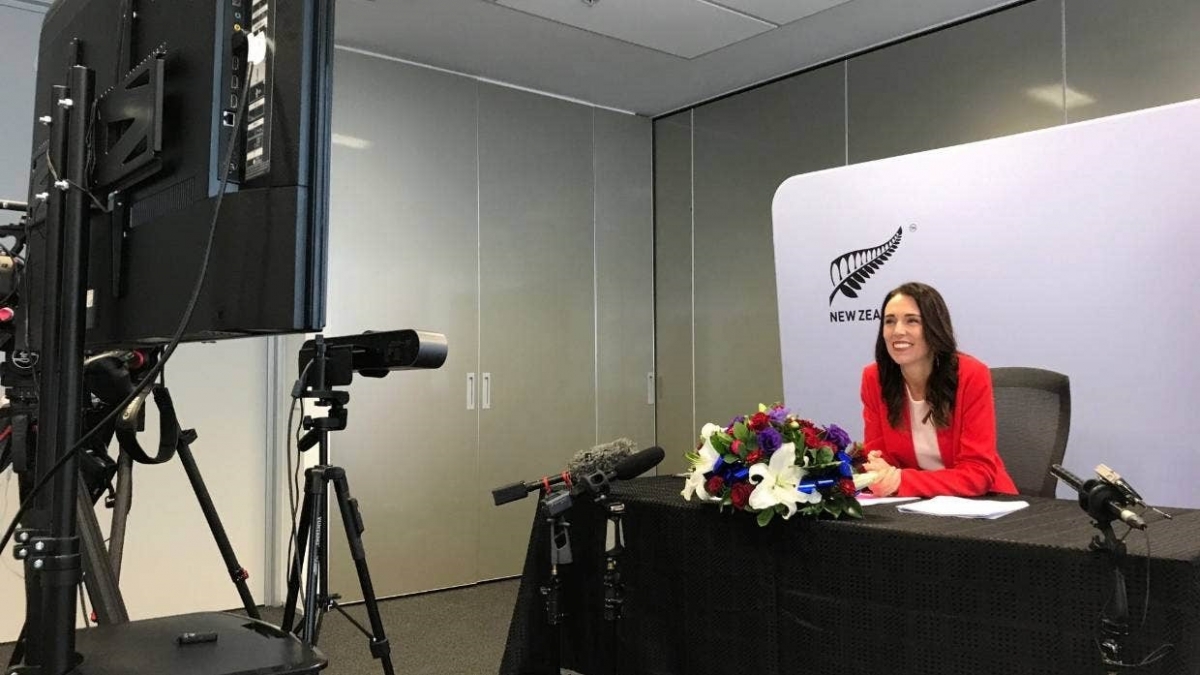 Thủ tướng New Zealand Jacinda Ardern dự hội nghị trực tuyến với Pḥng Thương mại Mỹ. Ảnh: Stuff.
