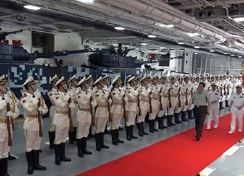 Hôm 23/4, ông Tập Cận B́nh thị sát tàu tấn công đổ bộ Hải Nam vừa được đưa vào biên chế Hạm đội Nam Hải (Ảnh: Đa Chiều).