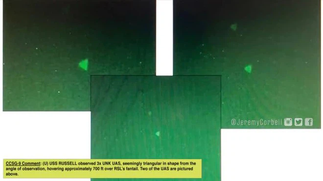 H́nh ảnh ghi lại vật thể h́nh tam giác bay lơ lửng trên tàu USS Russell năm 2019. Ảnh: Jeremy Corbell.