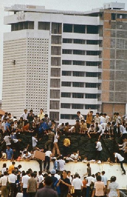 Người dân Sài Gòn tìm đường thoát trên bến phà Thủ Thiêm trên bến sông Bạch Đằng  Ngày 28 - 4 - 1975, người dân leo qua hàng rào bến cãng để trốn thoát khỏi Sài gòn.  Những cửa ngõ duy nhất có thể thoát ra khỏi Sài Gòn như Toà Đại Sứ Mỹ,khu DAO ở gần Air Vietnam và bến Bạch Đằng, thì lúc nào cũng đông nghẹt người chen chúc chờ đợi một cơ hội cuối cùng. Đa số là thành phần trong chính quyền cao cấp hoặc những người có liên hệ với Mỹ trước đây.