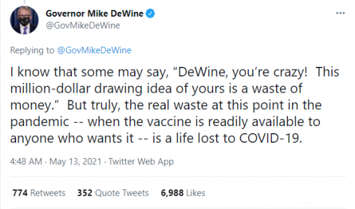 “Một số người có thể chỉ trích vì rằng chương trình này làm lãng phí cả triệu đôla”, ông DeWine nói. Tuy nhiên, ông nói thêm rằng trong thời điểm này, thiệt hại lớn nhất chính là mạng sống con người – điều mà vaccine có thể cứu được.