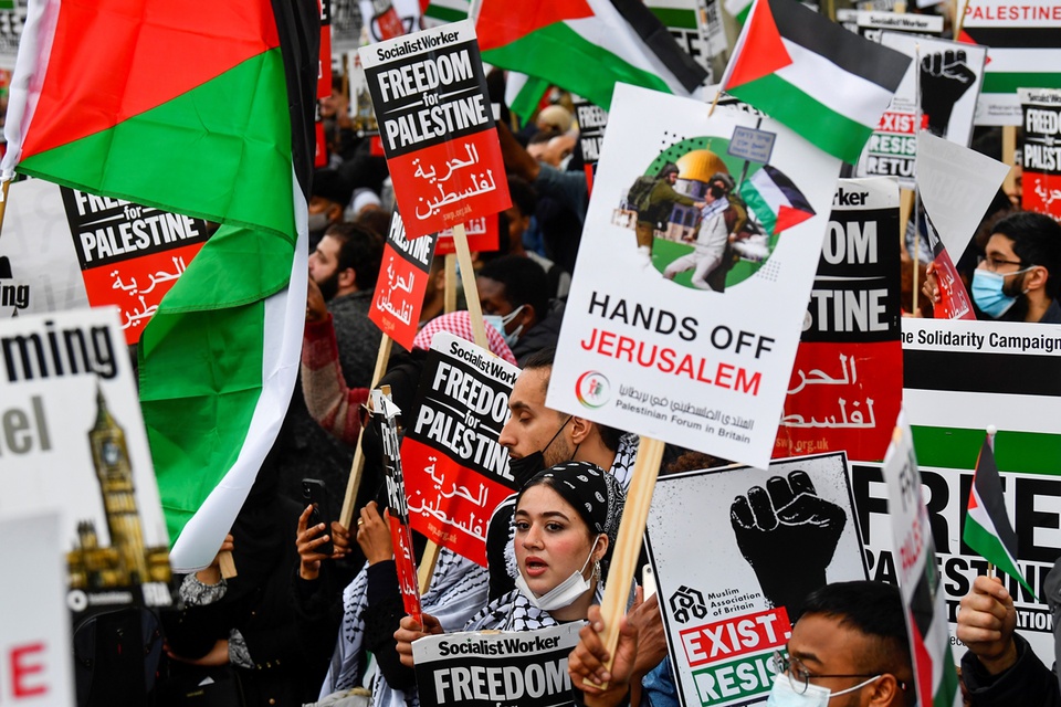 Không chỉ ở Mỹ, người dân nhiều nước trên thế giới cũng xuống đường ủng hộ người Palestine. Tại Anh, hàng nghìn người tập trung tại London vào ngày 11/5. Người tổ chức cho rằng Anh cần hành động ngay để chấm dứt tình trạng bạo lực đối với người Palestine. Ảnh: Reuters.