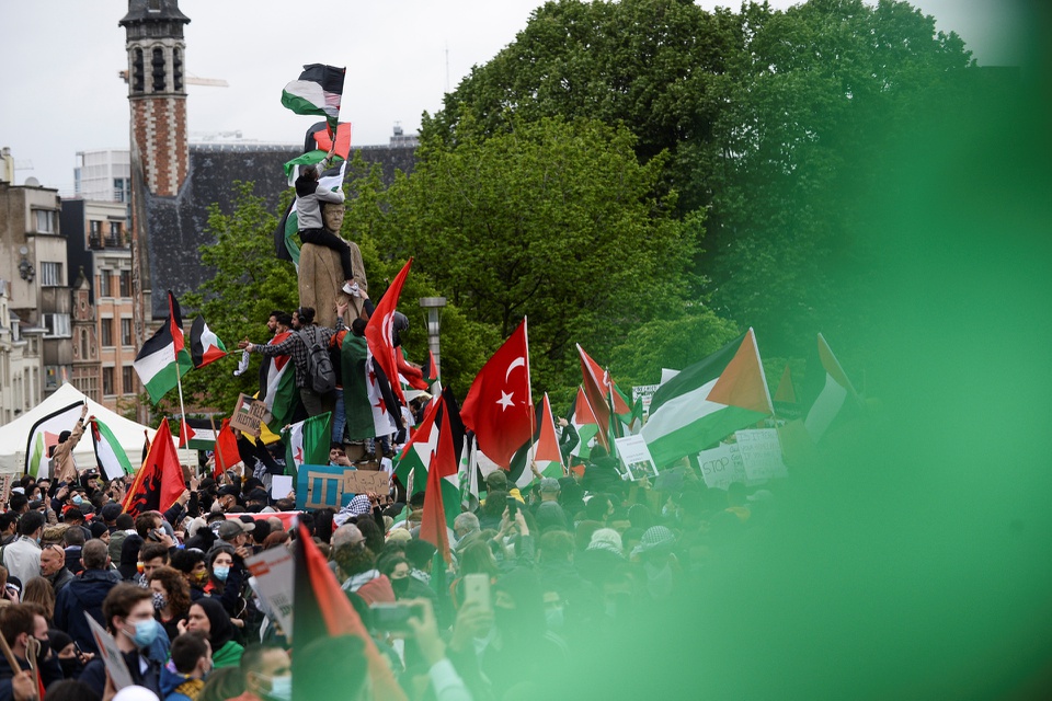 Căng thẳng giữa hai bên bắt đầu tại Đông Jerusalem vào đầu tháng 5, khi người biểu tình phản đối việc các gia đình Palestine tại khu vực Sheikh Jarrah, Jerusalem có nguy cơ bị trục xuất khỏi nơi ở. Xung đột cũng nổ ra giữa người Palestine với cảnh sát Israel sau khi cảnh sát xông vào nhà thờ Hồi giáo Al-Aqsa. Trong ảnh, người biểu tình ở Brussels hôm 15/5. Ảnh: Reuters.