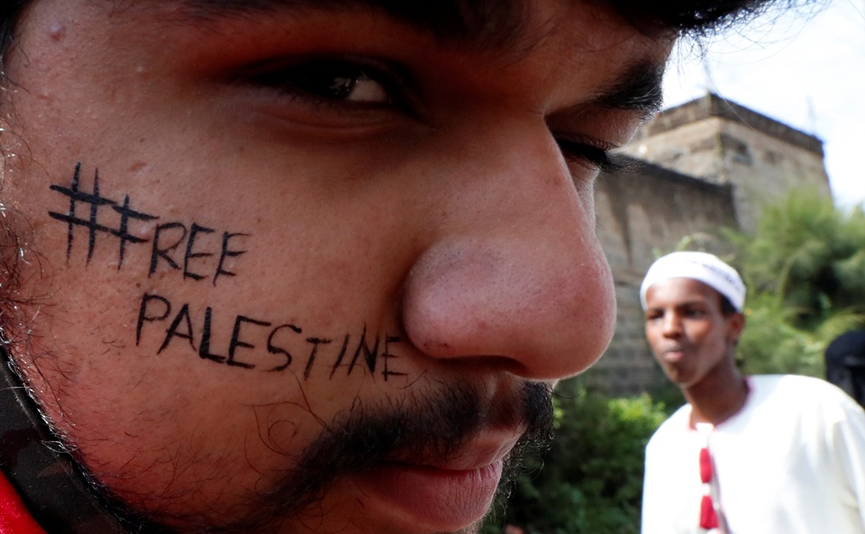 Một người biểu tình viết chữ "Giải phóng Palestine" lên má đứng bên ngoài giáo đường Do Thái Masjid Al-Salaam tại Nairobi, Kenya vào ngày 13/5. Cảnh sát phải dùng hơi cay để giải tán đám đông hơn 200 người. Ảnh: Reuters.