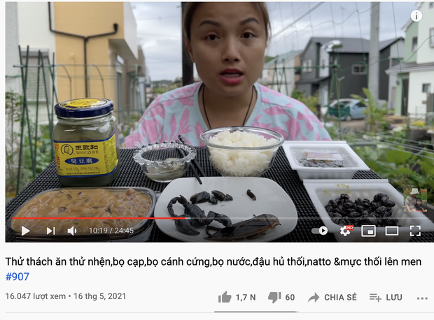 Mới đây, Quỳnh Trần JP vừa "trở lại" mảng ăn uống kinh dị bằng một clip khác sốc từ tiêu đề: Thử thách ăn thử nhện, bọ cạp, bọ cánh cứng, bọ nước, đậu hủ thối natto & mực thối lên men.