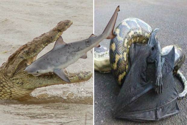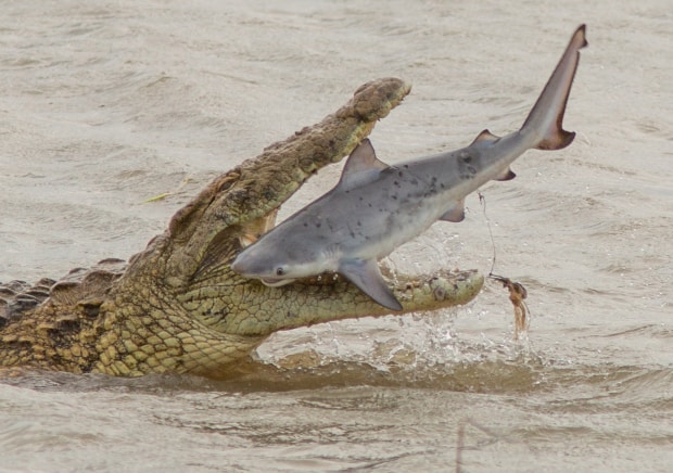 Cá sấu và cá mập cùng xuất hiện ở vùng nước ở Úc, nhưng khi đối đầu nhau trong trường hợp này(theo bức ảnh), cá sấu là kẻ chiến thắng. Theo thống kê, có khoảng 180 loài cá mập đang trú ngụ ở Úc. Ảnh: Mediadrumimages/Mark Ziembicki