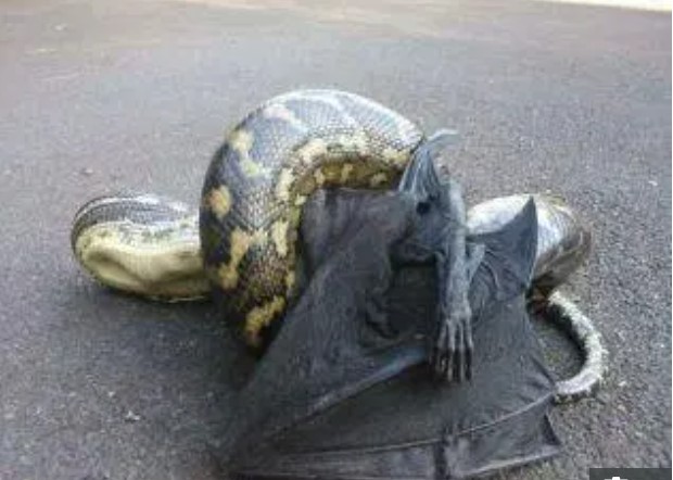 Bước ra khỏi cửa và được chứng kiến cảnh này, chắc hẳn không ít người sẽ bị sốc. Những con dơi cáo khổng lồ ở Úc có thể dài tới 1,6 mét. Nhưng ngay cả với kích thước đó, nó cũng có thể trở thành mồi ngon cho "loài máu lạnh không chân". Ảnh: The Sun