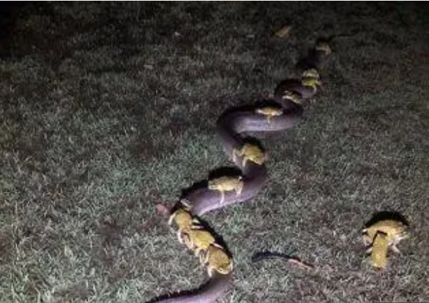 Thông thường, ếch và cóc là mồi ngon của rắn nhưng những con cóc mía trong bức ảnh này là ngoại lệ. Chúng ngồi trên lưng rắn như các hành khách trên đoàn tàu. Cóc mía được du nhập vào Úc từ những năm 1930. Nhiều loài săn mồi dè chừng cóc mía bởi chất độc đáng sợ trên da. Ảnh: The Sun