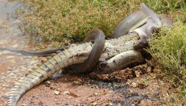 Một con trăn đang nuốt trọn con cá sấu lớn. Nhờ xương sọ, dây chằng và các cơ chuyên biệt, trăn có thể nuốt các con mồi có kích thước lớn hơn cơ thể nó nhiều lần. Ảnh: The Sun
