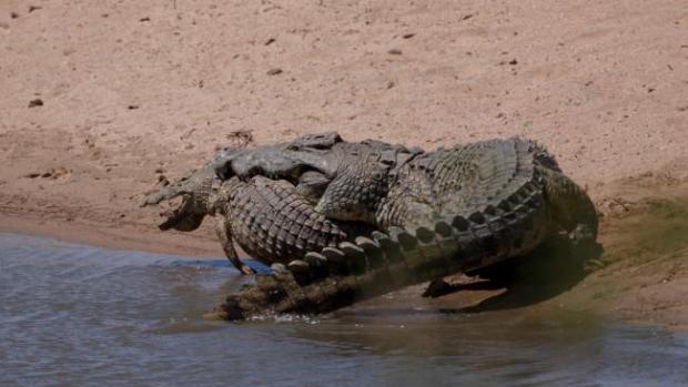 Con cá sấu khổng lồ ngoạm một đồng loại nhỏ hơn. Ảnh: The Sun