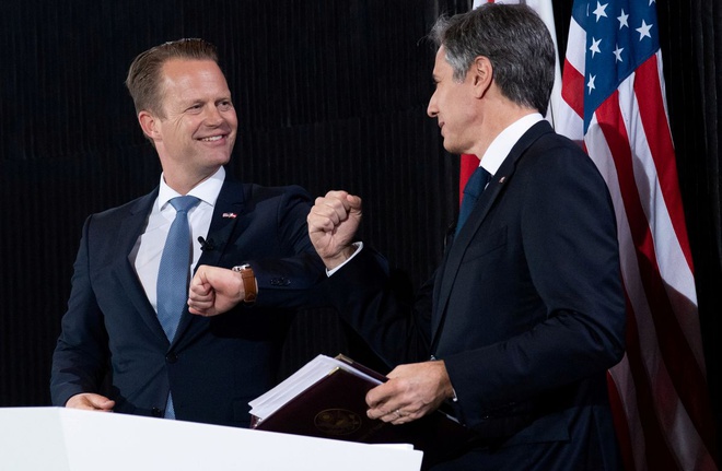Ngoại trưởng Mỹ Antony Blinken và Ngoại trưởng Đan Mạch Jeppe Kofod chạm khuỷu tay vào cuối buổi họp báo chung tại Copenhagen, Đan Mạch vào ngày 17/5. Ảnh: Reuters.