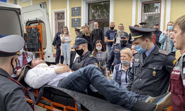 Nhà hoạt động đối lập Belarus Stsiapan Latypau được đưa từ tòa án đến bệnh viên trên một chiếc xe cứu thương. Ảnh: AP.