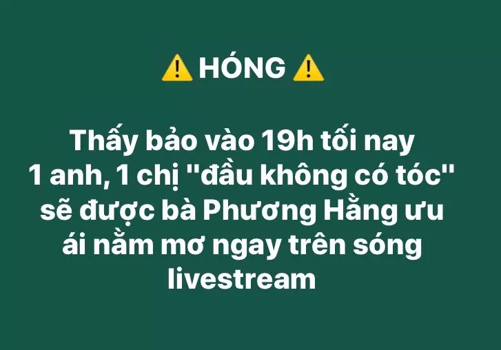 "Thấy bảo vào 19h tối nay 1 anh, 1 chị đầu không có tóc sẽ được bà Phương Hằng ưu ái nằm mơ ngay trên sóng livestream", tài khoản chia sẻ.
