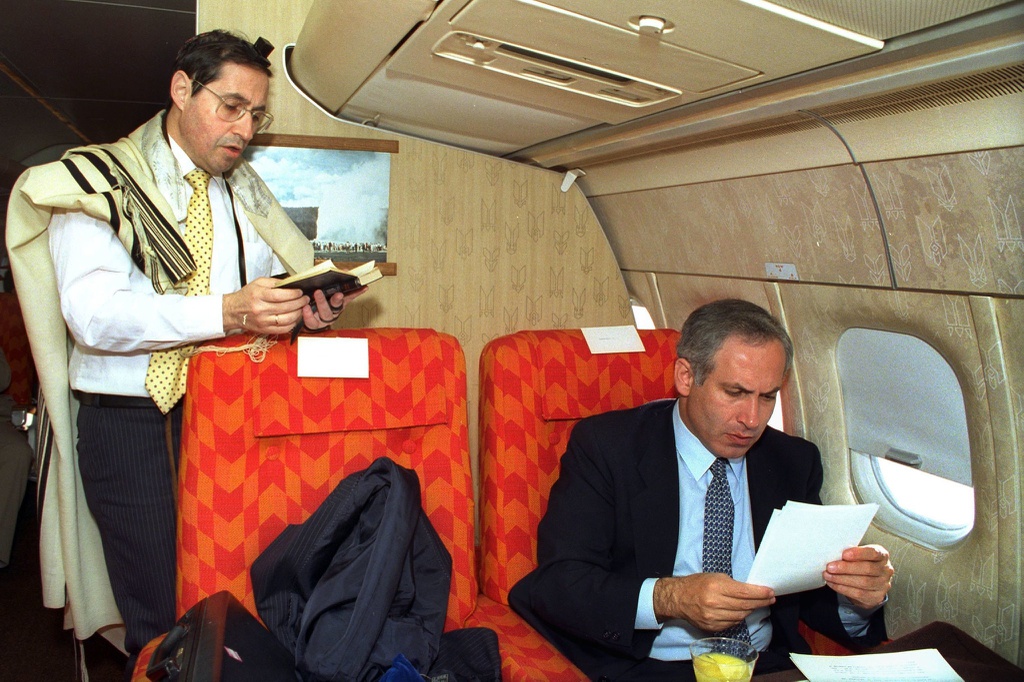 Ông Netanyahu (phải) trên chuyến bay từ New York đến Washington vào năm 1989, khi ông giữ chức thứ trưởng ngoại giao. Ông gia nhập đảng Likud vào năm 1988 và được bầu vào Quốc hội Israel. Ảnh: Văn pḥng Báo chí Chính phủ Israel.