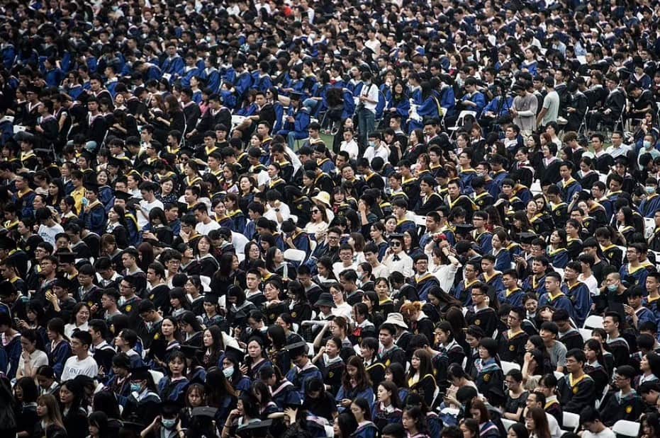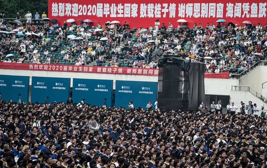 Các sinh viên, phần lớn trong trang phục tốt nghiệp, ngồi thành từng hàng dài san sát nhau mà không đeo khẩu trang, ở sân vận động thuộc Đại học Sư phạm Trung ương Trung Quốc.
