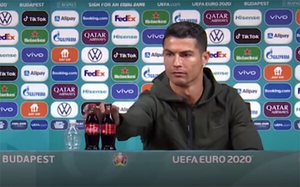 C. Ronaldo là người khởi xướng phong trào từ chối đồ uống của nhà tài trợ khi bỏ hai chai Coca rồi chọn nước lọc trong buổi họp báo tối 14/6. Sau đó, tiền vệ Locatelli của tuyển Italy đã "học theo" rồi Pogba cũng bỏ bia ra khỏi khung hình. Hai cầu thủ Andriy Yarmolenko của Ukraine và John McGinn của Scotland lại đem chuyện này ra làm trò cười trong họp báo.