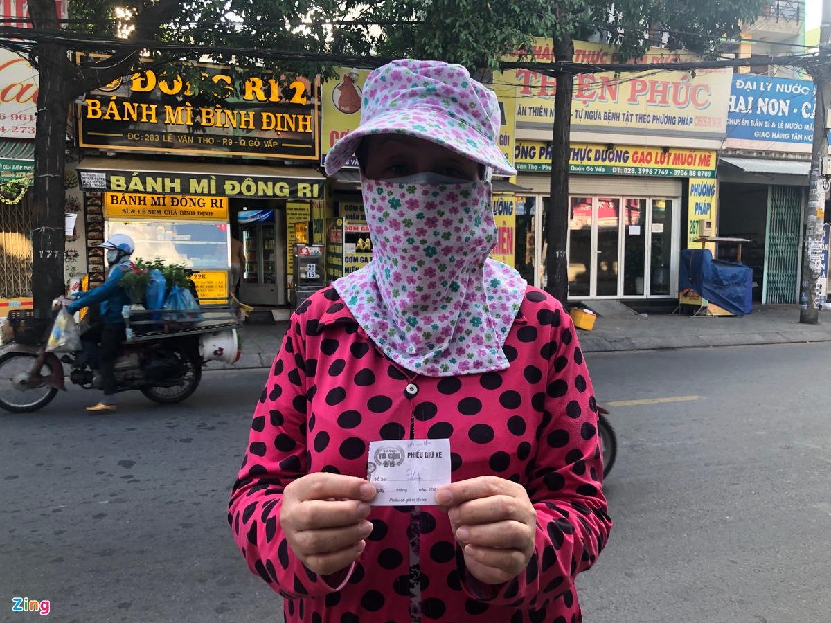 Cô Trần Thị Thanh Thuỷ (61 tuổi) đến tiệm cơm từ 16h để nhận phiếu. Mỗi ngày tiệm chỉ phát ra 300 phiếu dành tặng bà con, cô sợ rằng đến muộn sẽ không có phần.
