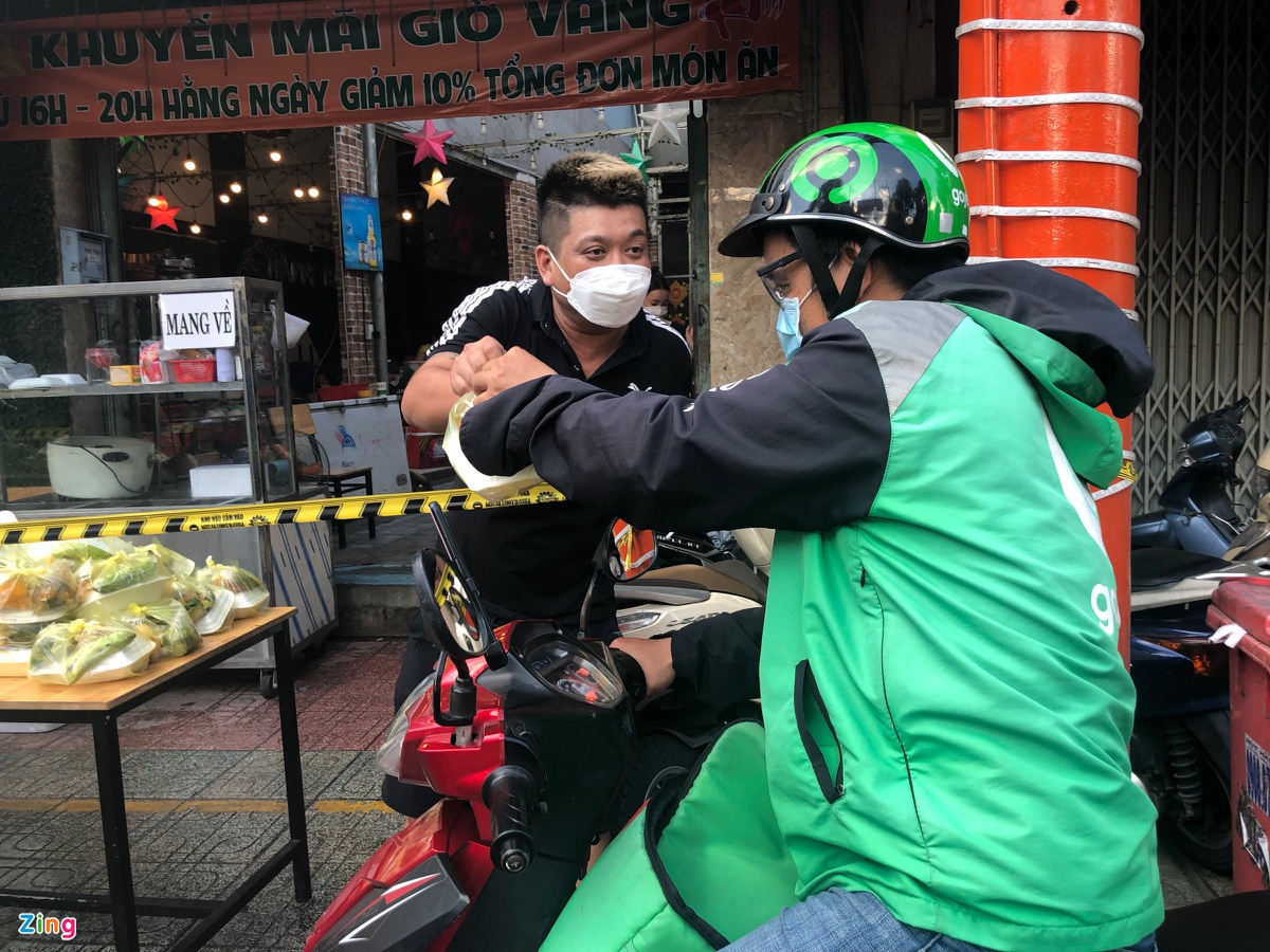 17h05, anh tài xế xe ôm công nghệ Nguyễn Thanh Hoài (35 tuổi) cũng dừng xe trước tiệm cơm. Anh đưa tờ phiếu của ḿnh và chờ đợi đến lượt. Trước đó anh đă đến từ 16h để nhận phiếu, tranh thủ chạy xe đi giao hàng rồi mới quay lại.