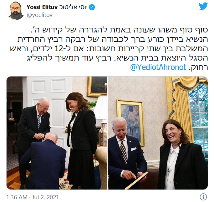 here on July 2 with the description: “@POTUS Jokingly kneels to Rivka Ravitz, the chief of staff of the Israeli president @PresidentRuvi, after she told him she is a mother to 12 (!) children.” The outlet credited the photo to Haim Tzach of the Israeli Government Press Office.
