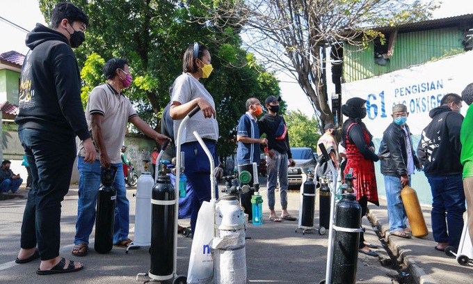 Người dân đứng chờ nạp b́nh oxy bên ngoài một nhà máy ở Jakarta, Indonesia, hôm 12/7. Ảnh: Reuters.