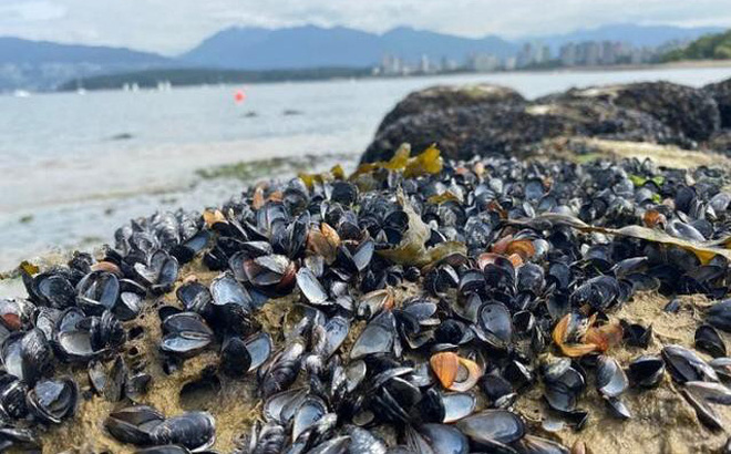 Ông Christopher Harley, một giáo sư trong khoa động vật học tại Đại học British Columbia đă t́m thấy vô số con vẹm chết há mồm và thối rữa trong vỏ của chúng tại băi biển Kitsilano hôm 11/7.